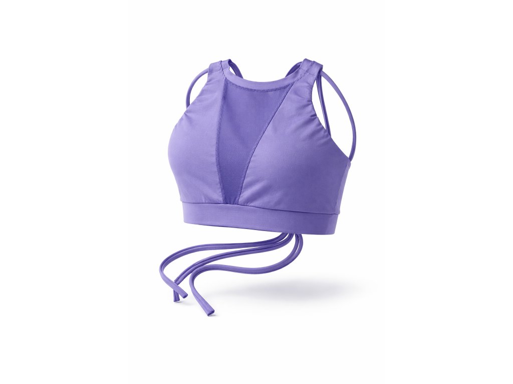 Lesklá lila lycra v kombinaci s mesh vytváří kontrast, který působí čistě a moderně.